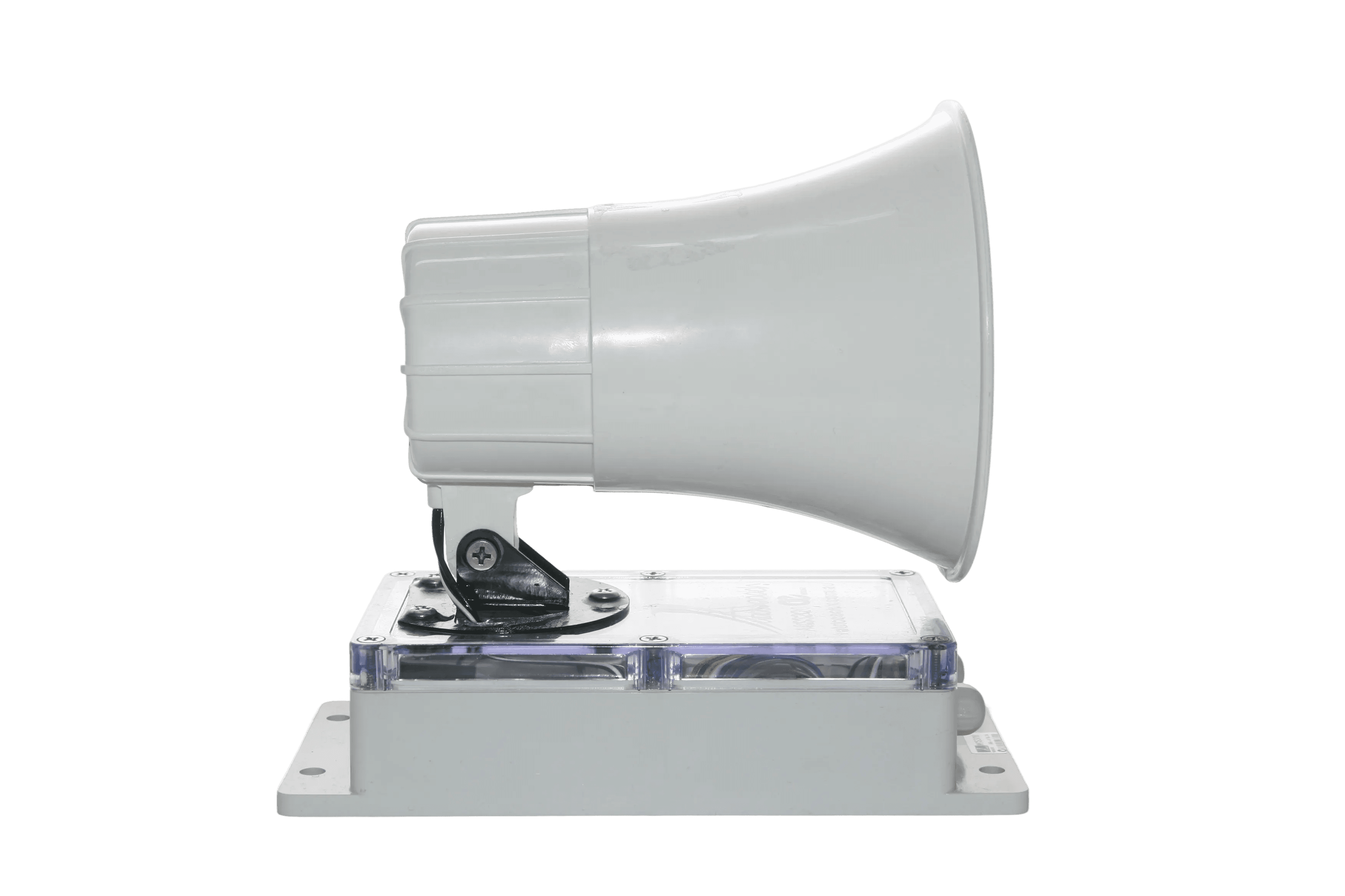 Speakers deliver audio and visual start commands so swimmers and officials begin together.